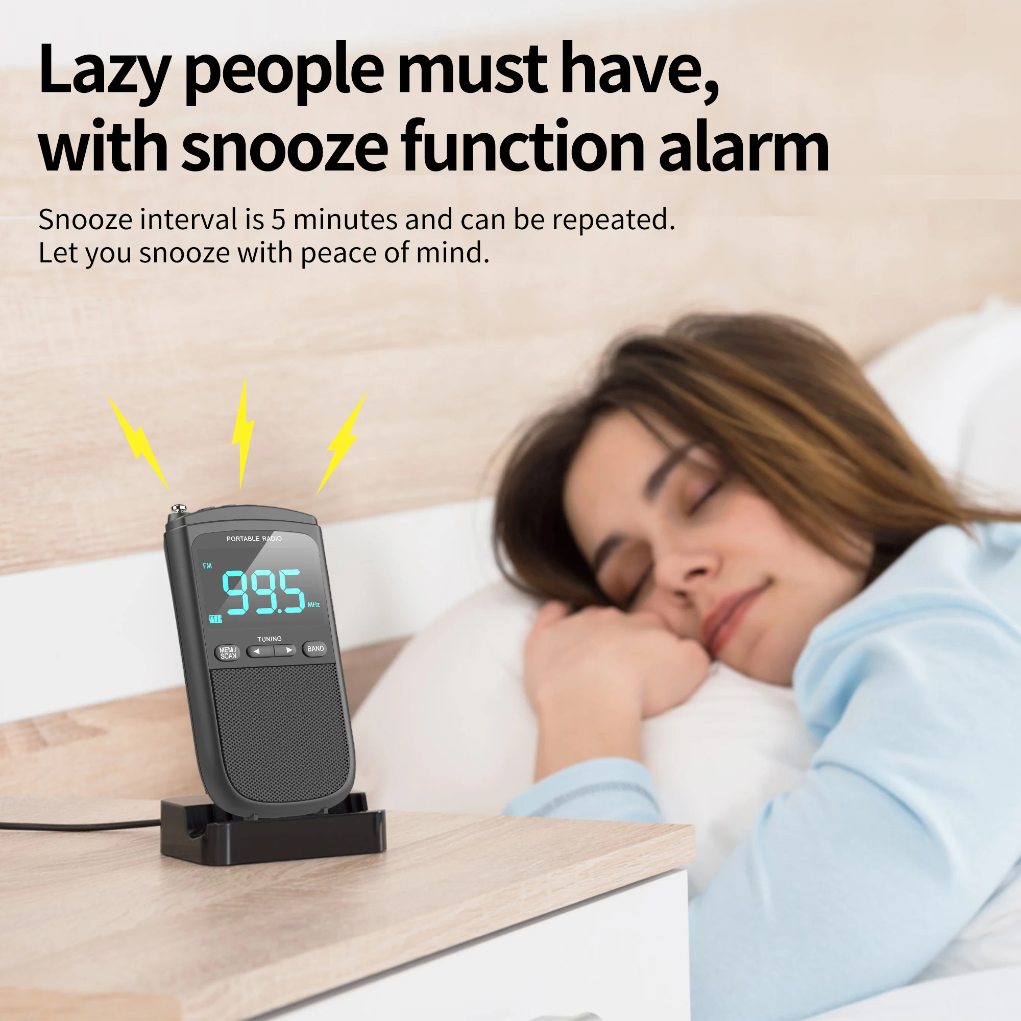 Mini Portable Radios Pocket AM/FM Receiver Stereo Speaker Rechargeable Radio with Alarm Clock for Outdoor Weather Broadcast